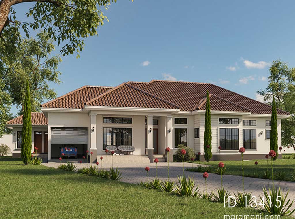 This bungalow house’s exterior leaves nothing to chance as you get to enjoy your beautiful backyard from the comfort of the exterior dining area. The walls have a modern finish with large high windows allowing for natural light to engulf the interior during the day as well as providing excellent ventilation. Included in the drawings for this 3 bedroom house plan you also get a matching 2 bedroom staff quarters.